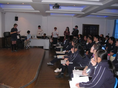 在联欢会上,首先是美国学生们带来的主题演说,向大家介绍了美国中学生的学校生活,他们用各种各样的图片、视频还包括现场演示,为中国学生们讲解了包括他们的课程,课外的艺术、体育活动、社区服务,甚至他们课间玩的游戏。除了学校生活,他们也向中国同学介绍了纽约城,包括一些著名的地标建筑、美国人的节庆文化,等等。总之,美国同学的介绍,使中国学生对美国的文化、美国学生的生活,又有了一次更深的感性认识。