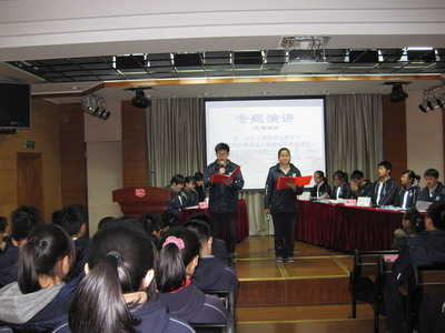 第一环节便是围绕“社会公众道德滑坡的质疑声中”展开的演讲环节。第一个上场是高一年级组的顾健喆同学。他的演讲铿锵有力,娓娓道来;相较之下高二、高三的学长们,显得更加泰然处之:他们自然的肢体语言与极具说服力、又不乏幽默的演讲,被众人喝彩。接下来的时政竞答环节,由于各个年级组之前的积极备战,选手们答题速度如行云流水般,正确率很高。在最后一轮的看图题中,打头阵的又是高一组,并根据图片,与当今热议的彭宇案件相结合。可能是由于辩证思维还不及高三同学的缜密,并未取得第一。
