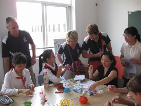 上午8时许,在东校区会议室举行了简短而隆重的欢迎仪式。随后,在20名小志愿者的陪同下,澳洲学生一行人走进了东校异彩纷呈的社团活动课,在铝线工艺社上,他们和西位学子一道用铝线制作出实用又造型时尚的“铁塔便签夹”;在花卉艺术社,他们兴致勃勃地用最常用的材料发挥想象,制作出各式花朵;篆刻社活动彰显出的深邃中华文化内涵,使来访师生叹为观止;在乐高机器人社,各种精密的智能机器人的精彩表现博得了澳洲同学的一致赞赏。访问全程中,小志愿者们流利的英语口语和大方热情的风度让来访的澳洲师生印象深刻,西南位育异彩纷呈的社团活动设置更是让澳洲师生乐在其中,流连忘返。分别之际中澳学生恋恋不舍,纷纷合影留念。
