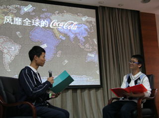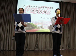 作为高一年级固定下来的社会考察项目,可口可乐公司的参观活动让同学们收获多多。年级组在活动前进行了介绍,并布置了课题。同学们集中围绕参观可口可乐公司后的体验与感想进行交流,形式多样,各具创意。有的以采访的形式,让在座同学谈感受;有的将公司创新理念与同学们的实际生活相联系,让大家耳目一新;有的绘画了将校徽与可口可乐瓶融合的LOGO,让同学们兴致盎然……在各班报告之中还穿插了有奖竞猜,增加了大会趣味性。无论形式如何变化,大家都将目光聚焦到了可口可乐公司从广告到瓶身设计的创新与发展的长远的目光上来。可口可乐的传承创新,源自对自身产品的准确定位,源自永不停歇的追逐发展。由此可见,成功离不开立志定位。