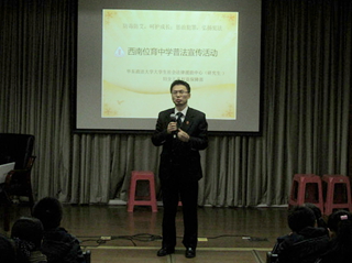 活动以法律知识有奖竞猜开场,抢答过程中同学们踊跃参与,气氛活跃。这一轻松活泼的环节不仅拉近了法律与同学们的距离,而且寓教于乐,使同学们获得了不少法律常识。随后普法宣传员们呈现了一出精彩的法制小品,宣传“远离毒品,关爱生命”。小品中人物和场景的设置都很切合同学们的实际生活,让同学们在剧情的推进中不仅获知了毒品的来源和流通渠道,而且逐步认识到毒品危害之大。两项活动不仅让同学们更加熟悉法律知识,而且意识到处在青少年这一相对弱势的社会群体中,在遇到威胁时大家应该及时拿起法律武器保护自己的权利和安全,而不是以暴制暴。