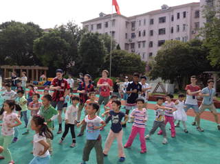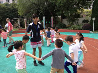 在角色扮演时间段,大哥哥们耐心得陪着小朋友们做游戏,扮演各种角色,有的扮演病人,有的扮演理发师,虽然小朋友们无法用英语和这些大哥哥们交流,但是一个微笑,一个拥抱,让彼此有了心的交流。