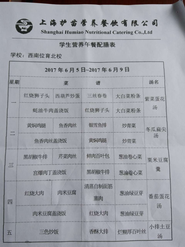 北校区第17周菜单